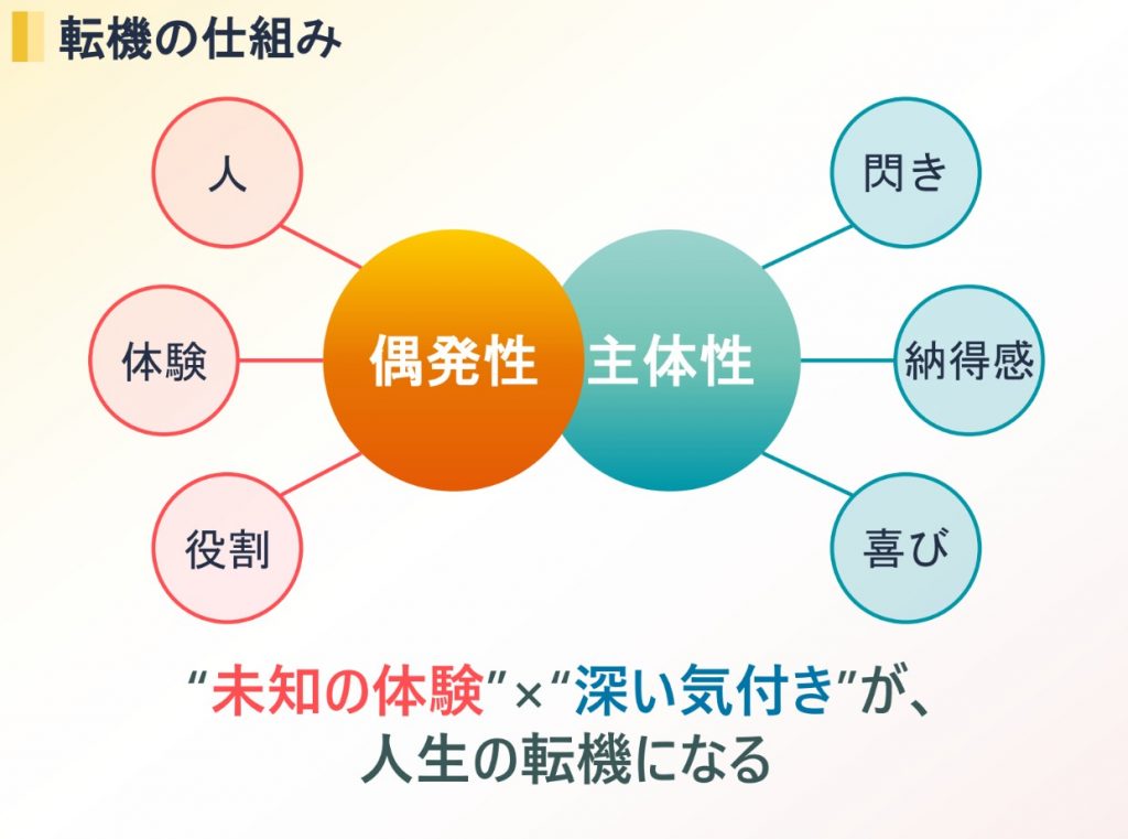 転機堂は「人生が変わる“転機”と巡り合う、大人の原体験サービス」をビジョンに掲げ、代表の松本さんが「転機の研究」を通して立ち上げた事業で、社会の隅で悩む「未明」の人々に人生を変える閃きを届けることを目指しています。